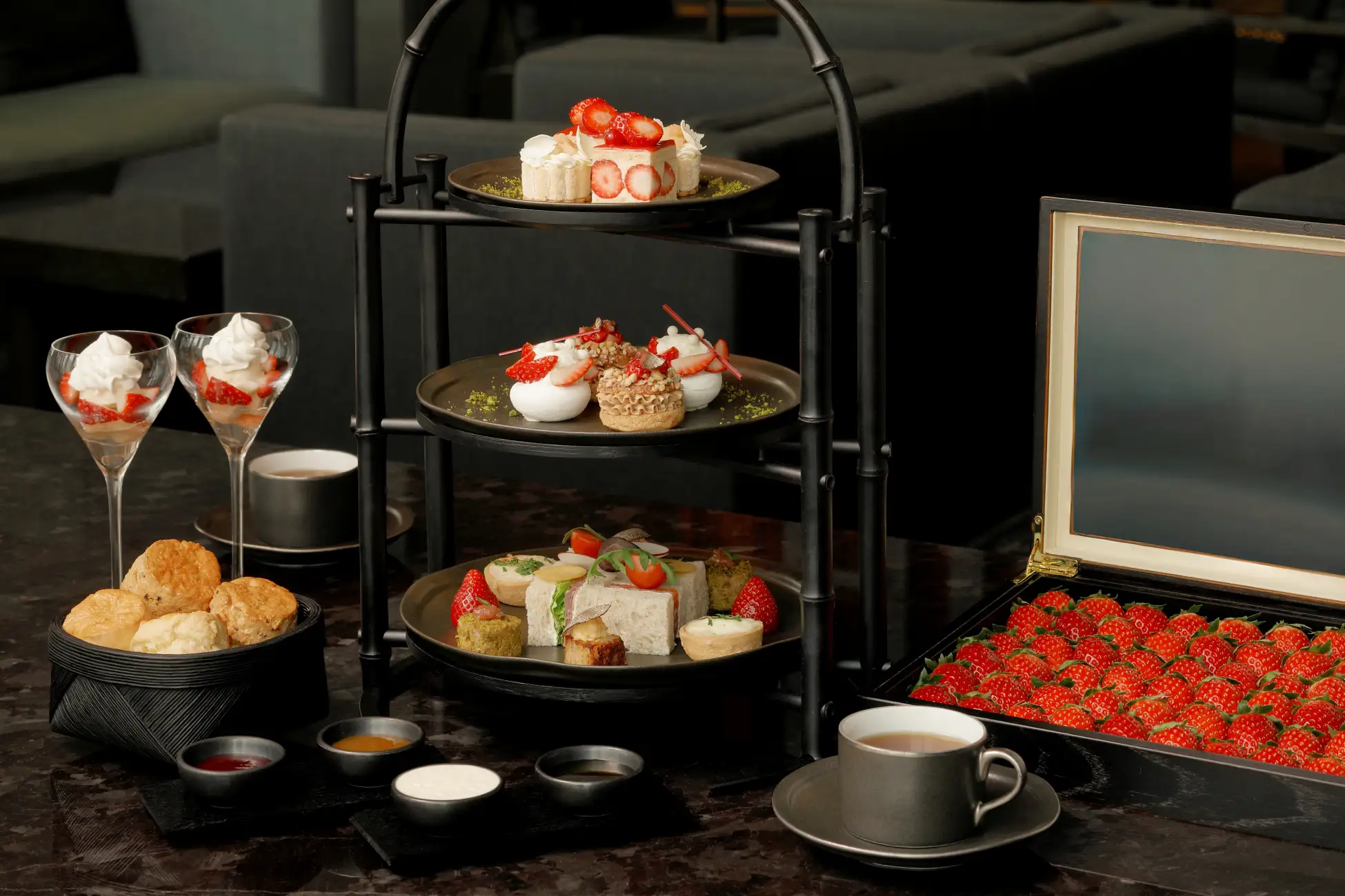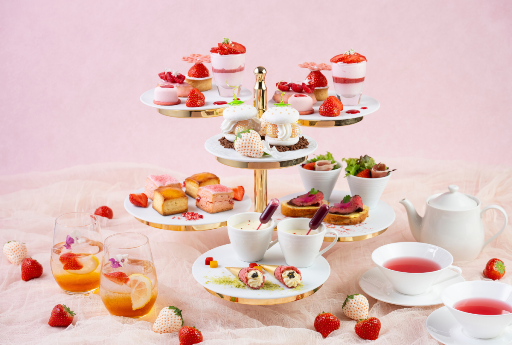 The “Strawberry Afternoon Tea” at the Atrium Lounge is a seasonal staple. For 2026, the theme celebrates a “marriage of strawberries and 10 types of fruits”, presenting 12 varieties of sweets and six savory items. The experience is served on a visually striking three-tier stand, emphasizing vibrant, fruit-forward pairings.